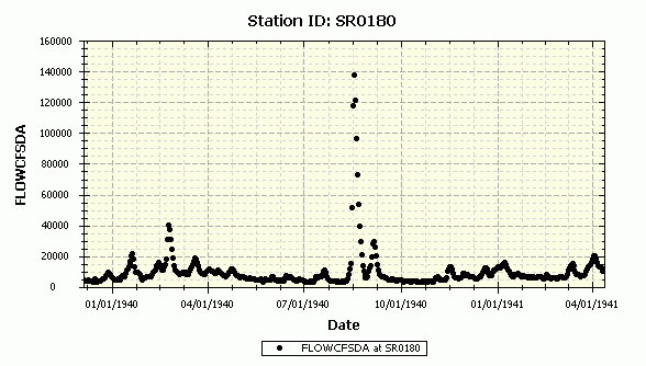Time series graphs display values associated with the selected Station ID and PCode versus time. Data series derived from data tables are initially formatted as symbols with no lines, whereas those from model output files (BMD) are formatted as lines with no symbols (thus suitable for comparing predicted and observed values for model calibration).