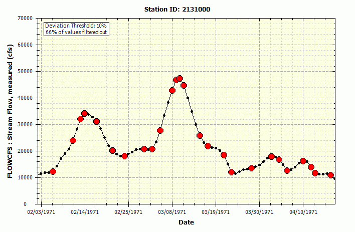 This option will process all selected time series data and filter it so that intermediate data points that nearly lie on a straight line will be removed. What is left is so-called "break-point" data, where only those points that have not been filtered out remain. In the graph below, the original data are plotted in black and the filtered data that remain are the red symbols: