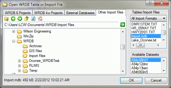 Instead of the Data Tables approach described above, you may wish to open Data Files; a familar Open File dialog is displayed and you can browse to the file you want to open. If you select a file-based table (e.g., Paradox, .db, dBase, .dbf, or Binary Modeling File, .bmd) the file will immediately open and you can begin to add data from that file. If you select one of the database formats (e.g., Access, .mdb, SqlLite, .sdb, or Firebird, .fdb), the above referenced Open WRDB Table or Import File form will be displayed so that you can select the table within the file you want to open.