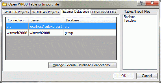 The panel on the left allows you to select Working and Master tables from previously defined WRDB 6 and 4.x projects. The External Databases tab allows you to select from previously configured database connections: