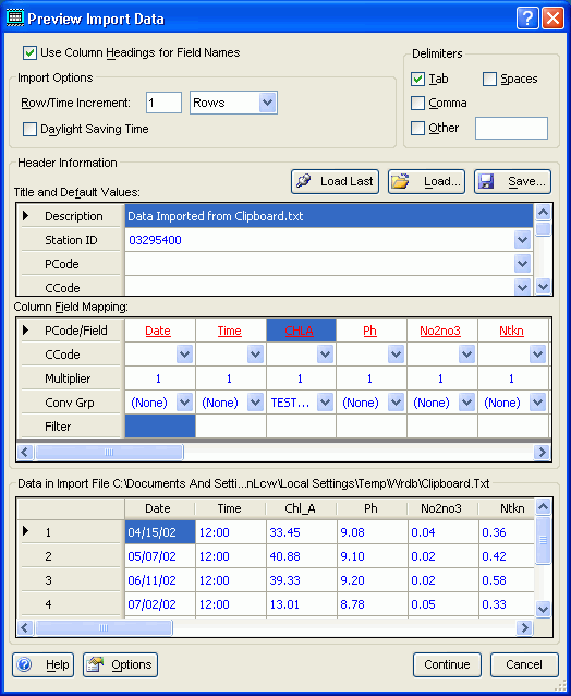 PCode/Field: this row contains either the parameter code to assign to all values in that column, or the WRDB field name associated with the column; click on the hyperlink to display the field mapping list: