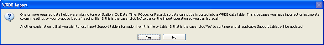 Validate Imported Data against Support Tables? This will compare imported values for Station ID, PCode, CCode, and RCode with values found in the appropriate Support tables. If not found, a warning will be issued and a new Support table entry will be made and you'll have to complete all other fields for the newly added records. In addition, all imported numeric Values (i.e., values imported under PCode column headings or the 'Result' column heading) will be compared with allowable ranges in the PCodes support table. Warnings will be issued if out of range values are found. This option will somewhat slow down the speed of import operations.