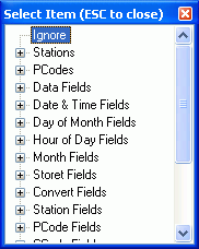 This list is divided into categories; expand the category and click on the desired item to map that column to that item. WRDB tries to help you out by examining the column headings and automatically assigning likely field names. In our example, if the first column ("Date Collected") had been given a more common name ("Date"), it would have been automatically assigned. However, because WRDB isn't sure about "Date Collected", it assigns the "Ignore" keyword instead, meaning "ignore this column entirely". All unrecognized column names are assigned "Ignore".
