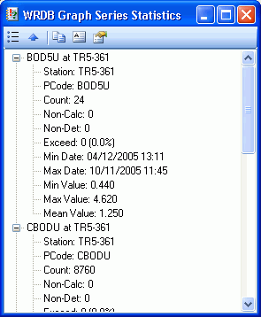 Click on Create Graph Notes toolbar button or context menu item on the WRDB Graph Series Statistics form above. This will display the statistics text in the Graph Notes property of the Graph Options form. Only one set of statistics can be displayed using this method, but it is the only way to display the summary statistics for all series.