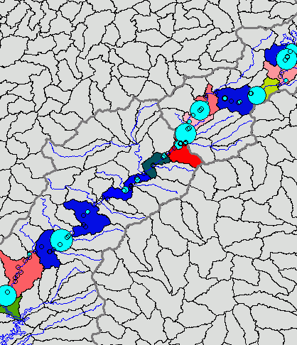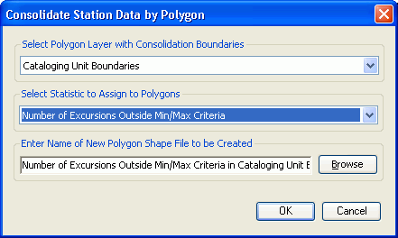 This routine is useful to take statistics computed at individual WRDB stations and consolidate them across a larger area. Selected statistics are consolidated into polygonal areas from another layer and a new polygon shape file is created with the statistics attached; this new shape file is added as a layer to the Water Resources Database layer group and a colored thematic scheme is assigned.