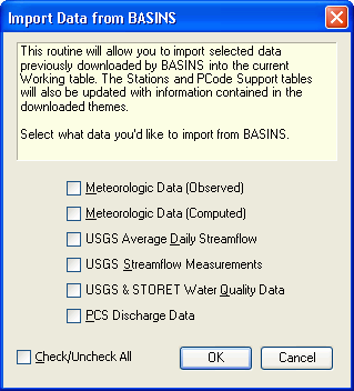BASINS automatically downloads historic data from a variety of sources (see the BASINS File | Download Met Data and Download Data). These data are stored in a variety of formats that are not amenable to display and analysis. You can import previously downloaded BASINS datasets into the currently active WRDB Project and Working table by selecting the data you want from this form: