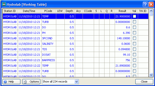The data browser is primarily intended to give you a read-only preview of a subset of the data in the current table. Initially, only the first 1000 records are displayed; you can select more or less records by selecting from the drop-down list or by just typing in a number. The columns correspond to the fields found in the data table as described in Database Structure. Note that the format of values in the Result column depends on the entries in the Sig_Figs field of the PCodes Support table.