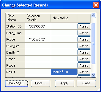 In the above example, after confirmation of the number of affected records, all records having a Station ID of "03295500" and PCode of "FLOWCFS" will have only their Result field changed (the former value will be multiplied by 10). Click the "Hints" button for help on entering information in the New Value column.