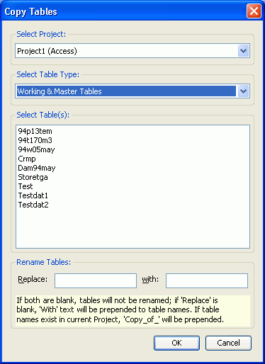 Copy From...: regardless of whether any tables are selected, this button will open another form that lets you copy multiple tables from another WRDB Project and rename them in the process: