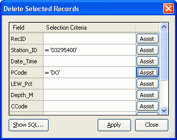 Records in the selected table are deleted based on the selection criteria. In the above example, all records having a Station ID of "03295400" and PCode of "DO" will be deleted (after confirmation of how many records that would be). You can click the Assist buttons to display forms that help you specify the selection criteria.