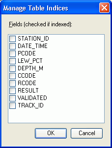 All table fields are listed; to add an index for a field, check it; to remove an index, uncheck it. Be aware that index creation and delete can be very time consuming, so patience may be required.