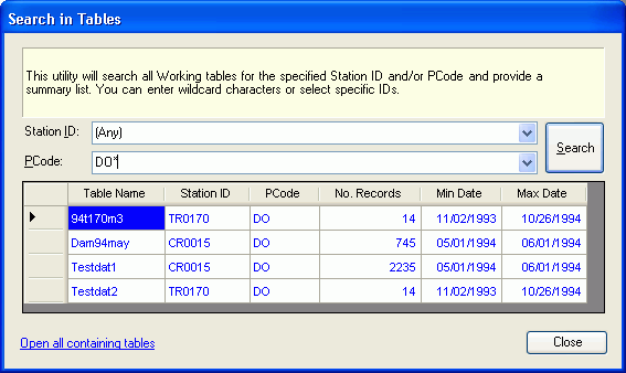 Search in Tables: this utility will search all Working tables for the specified Station ID and/or PCode and provide a summary list: