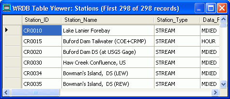 Import Data: when a single table is selected, you can browse to a tab-delimited text file to be imported; data will be appended to the selected table. This import file must be in the correct format (with appropriate column headings) and is very fast because it does not validation (that is, it is possible to import data at stations that don't exist in your Stations table). If you want to import data from a variety of different formats with Support table validation and manually map import columns to WRDB fields, use Edit | Import File or Table or File | Project Management | Import Support Tables.