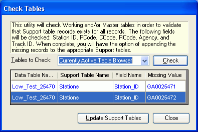 You have the option of checking either 1) the currently active table, 2) all open tables, or 3) all Working and Master tables in the project. When you click the Check button, these tables are scanned and the Station ID, PCode, CCode, RCode, Agency, and Track ID fields are examined to see if they reference missing Support records. All such missing items are listed in the grid.