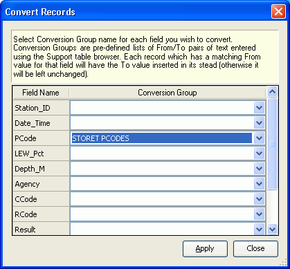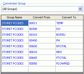 The Conversion Groups Support table allow you to create named sets of value pairs. For example, assume that you have created tables that utilize Legacy-style STORET PCodes and you want to convert them to mnemonic PCodes you use for your project. You might create a Conversion Group called "STORET PCODES" which contains the following paired values: