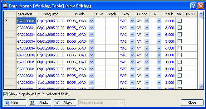 An alternative way to enter Working data one record at a time using a spreadsheet-style grid is accomplished by selecting Edit | Edit Data in Grid. When you do, all existing data is displayed in a grid form (so if the table is large, it may take a long time to load the data), and you can edit or add new items by typing or selecting from drop-down lists: