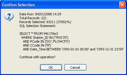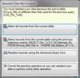 If you have changed databases (or updated the selected database) since the last time you selected records for output, your selection is assumed to be possibly invalid and you are warned (unless you have set Expert mode). A shortcut is offered that allows you to reselect data from the currently selected table and continue: