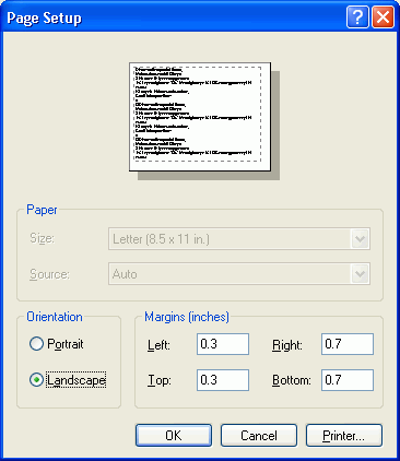 Change your default printer and configure it by selecting File | Page Setup. The standard page setup dialog is displayed: