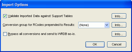 Conversion group for RCodes prepended to Results? This option relates to the automatic conversion of RCodes upon import. If RCodes are being imported as a separate column, then the 'Conv Group' column heading can be specified to use the ConvGrp Support table you've previously populated with named conversion groups (see above). However, the above procedure only works if RCode is being imported from a separate column. If the RCode is 'embedded' in the numeric Result field (like '<1.23') and you want to do the RCode conversion, select the appropriate group name; otherwise select '(None)'. This option is likely to have relatively little impact upon import speed.