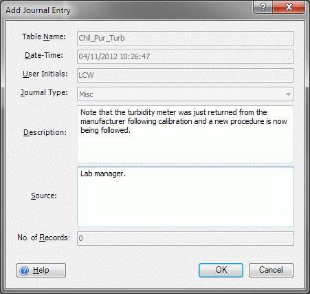 WRDB 6.0's Journal feature allows you to add an ad-hoc journal entry and associated with the active table to better manage your workflow. The journal entry will be assigned the Misc entry type and you are shown this dialog: