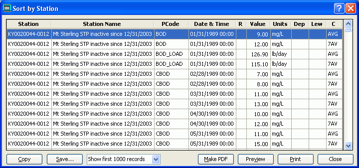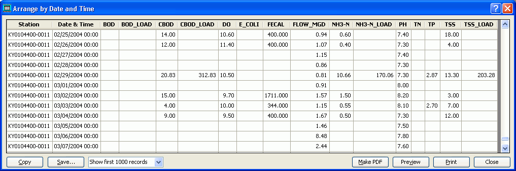 The report above is the "Sort by Date-time" report; all parameters in the dataset are placed in columns, sorted by PCode. Missing values for a given date are left blank. If there are more than one observations for a PCode at a given date and time, they are averaged and displayed.
