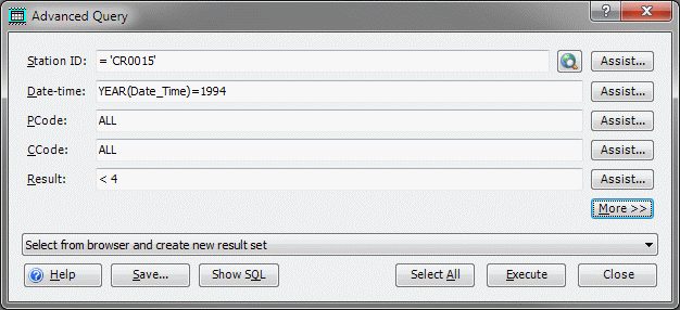 Normally, only the most-commonly used query fields are displayed (the top five) but clicking the More>>/<<Less button shows/hides the lower portion of the form which exposes all data fields.