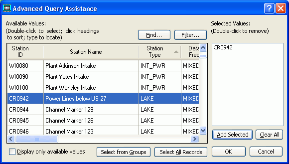 After you identify all desired station IDs and click "OK", WRDB places a SQL query string on the Advanced Query form in the form "Station_ID In (item1,item2,&ldots;)". For advanced users, any valid SQL query string is allowed in this field (such as "Station_ID Like CR*"). The assistance forms for CCodes and PCodes are very similar to the Station ID assistance form.