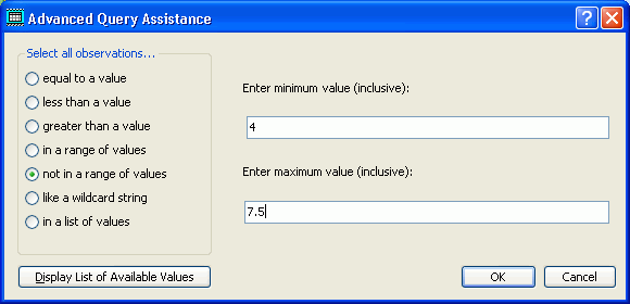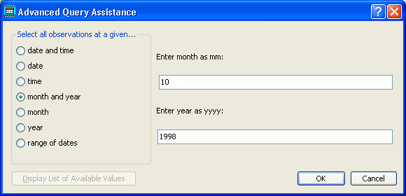 The Assist buttons call up screens that let to interactively select or enter criteria for the query. For example, to get assistance in entering Station ID criteria, click the Assist button to get this screen: